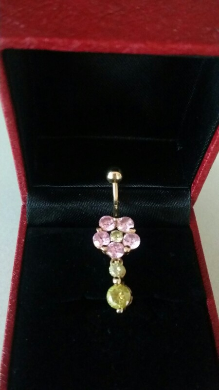 꽃모양큐빅이 엄청귀여운14k 배꼽피어싱입니다. 길이는4cm정도됩니다.