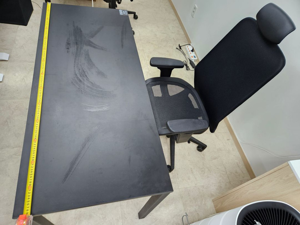 책상 사이즈는 사진을 참고하세요.의자는 듀오백것입니다. 큰 책상 2개(140cm×60cm×70cm).작은 책상 2개(110cm×67cm×74cm)별도 구매 가능합니다.
