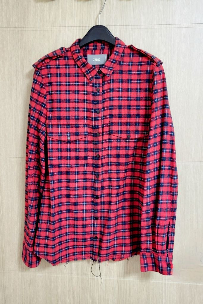 쟈딕앤볼테르 체크 해골 셔츠 입니다. 구매는 현대천호에서 했습니다. 소재가 매우 부드럽고, 등판의 해골무늬가 예뻐서 구매했어요. 구매후에 3-4번 입고 보관만 했어요. 사이즈는 스몰이거 보통 55 넉넉히 맞아요 이염,얼룩 보풀등 특이사항 없습니다., 새옷은 아니라서 새옷느낌은 아닙니다. 제품 특성상 교환, 환불 어려우니 구매전 문의 많이주세요.