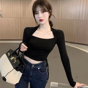 검정 스퀘어넥 크롭 스트링 티셔츠 블랙