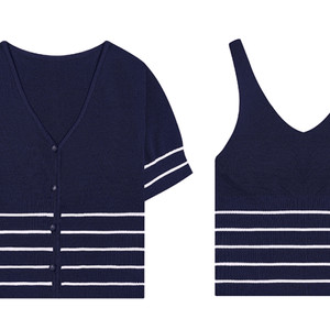 브이넥 단가라 반팔 니트가디건&나시 네이비