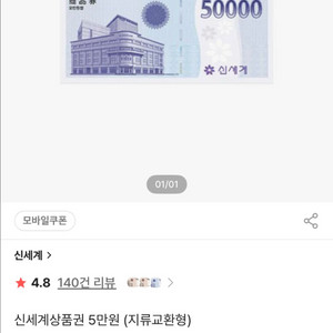 신세계 모바일 상품권 5만원권 1장 ->43,000
