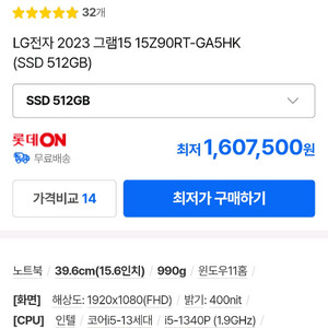 LG 그램 최고급 쿼드 코어 i5 16G 초경량 윈11